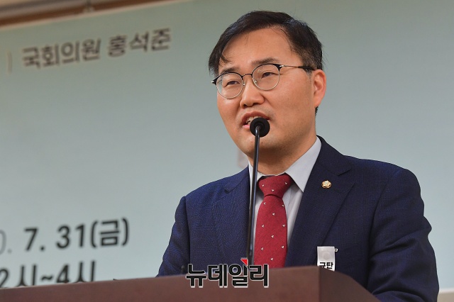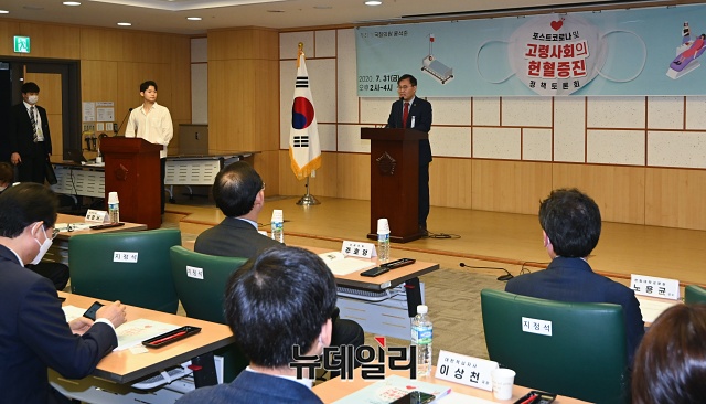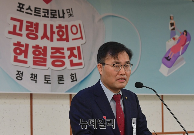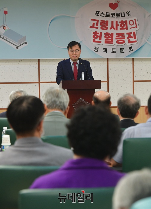 홍석준 미래통합당 의원이 31일 오후 국회 의원회관에서 열린 '포스트코로나 및 고령사회의 헌혈증진' 정책 토론회에서 개회사를 하고 있다.