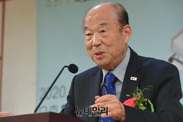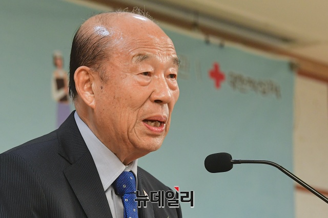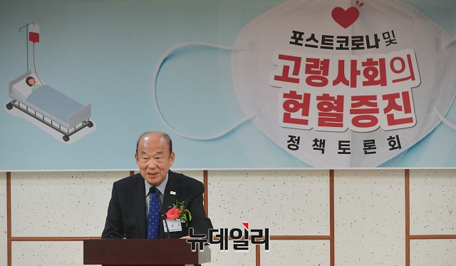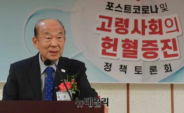 박경서 대한적십자사 회장이 31일 오후 국회 의원회관에서 열린 '포스트코로나 및 고령사회의 헌혈증진' 정책 토론회에서 축사를 하고 있다.