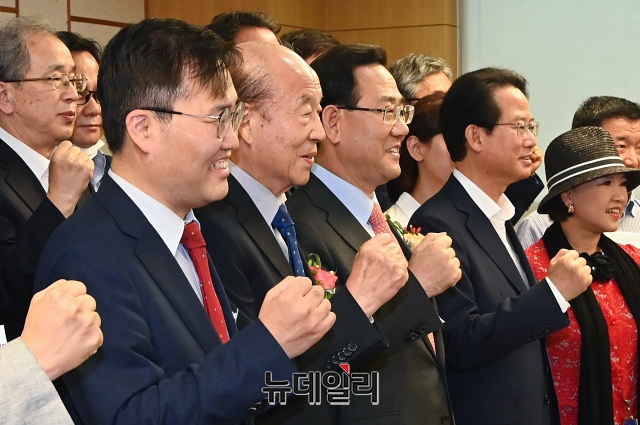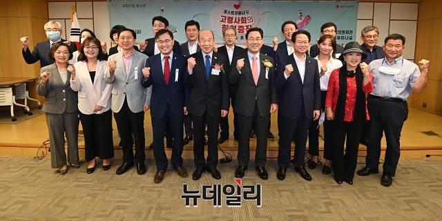 주호영 미래통합당 원내대표, 홍석준 의원, 박경서 대한적십자사 회장을 비롯한 참석자들이 31일 오후 국회 의원회관에서 열린 '포스트코로나 및 고령사회의 헌혈증진' 정책 토론회에서 기념촬영을 갖고 있다.