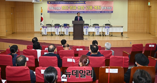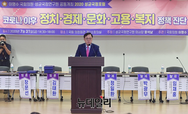 이명수 미래통합당 의원이 31일 오후 국회 의원회관에서 열린 '코로나19 이후 정치·경제·문화·고용·복지 정책 진단' 포럼에서 개회사를 하고 있다.