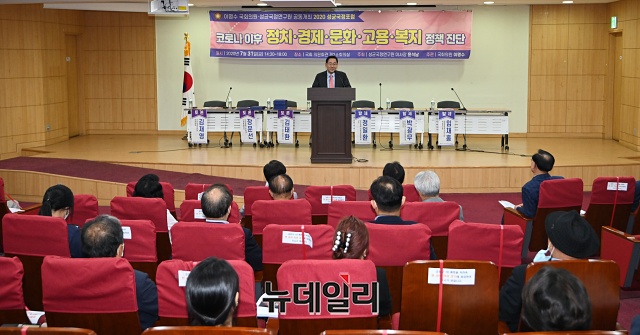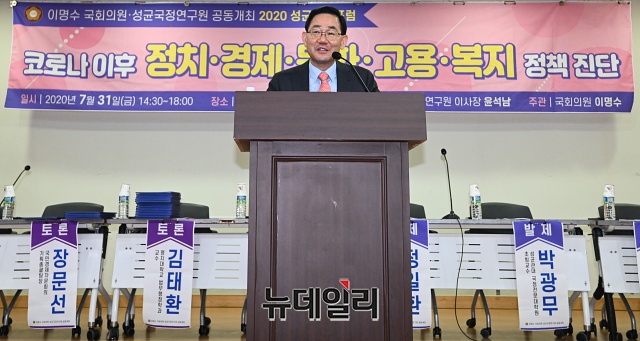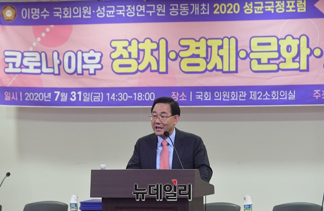 주호영 미래통합당 원내대표가 31일 오후 국회 의원회관에서 열린 '코로나19 이후 정치·경제·문화·고용·복지 정책 진단' 포럼에서 축사를 하고 있다.