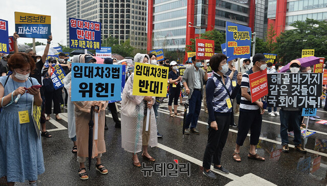 '6.17 소급적용 피해자 구제를 위한 모임' 참가자들이 1일 오후 서울 여의도공원 인근에서 열린 '전국민 조세저항 운동' 집회에 참석해 '임대차 3법 위헌', '민주없는 독재정부' 등이 적힌 피켓을 들고 정부의 부동산 정책을 규탄하고 있다.