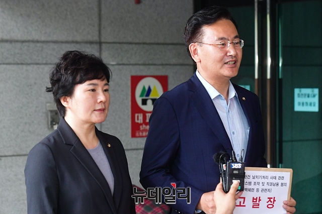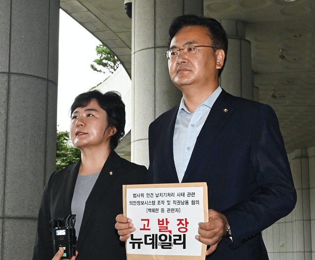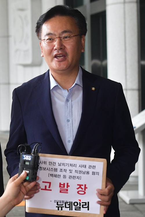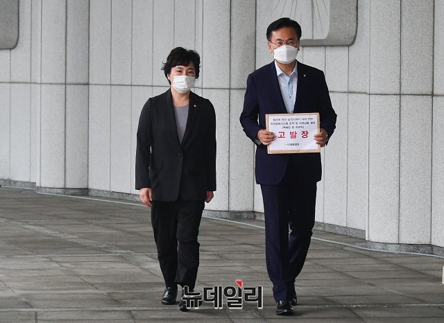 유상범 미래통합당 의원, 조수진 의원이 3일 오전 서울 서초구 대검찰청에서 백혜련 더불어민주당 의원 등 관련자들을 공전자기록위작죄 및 직권남용 혐의로 고발장을 제출하고 있다.조 의원은 "7월 29일 국회 법사위에서 여당이 일방적으로 안건을 상정하고 처리하기 위해 의안정보시스템을 조작한 혐의를 미래통합당 법사위원들이 확인했다"며 "여당은 야당에게 해당 법안을 사전에 설명한 일이 없고, 해당 법안에 대한 여야간 논의 역시 없었다"며 고발이유를 밝혔다.