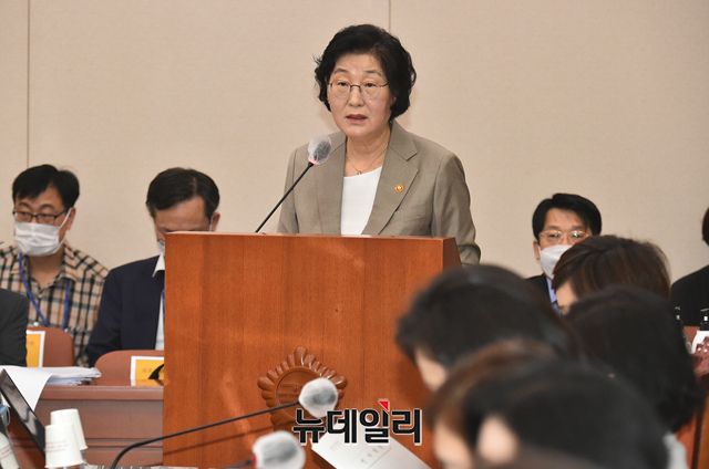 이정옥 여성가족부 장관이 3일 오전 국회에서 열린 여성가족위원회 전체회의에서 업무보고를 하고 있다.