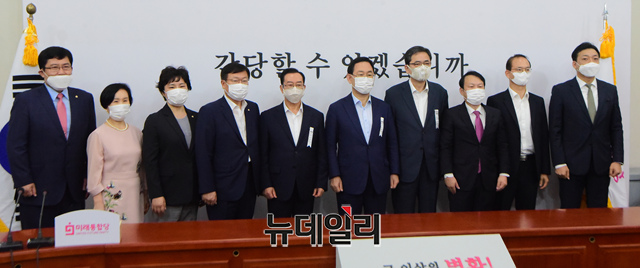 주호영 미래통합당 원내대표, 이종배 정책위의장, 곽상도 위원장 등 참석자들이 3일 오전 국회에서 열린 '이상직의원·이스타 비리 의혹 진상규명TF' 1차회의에서 기념사진을 촬영하고 있다.