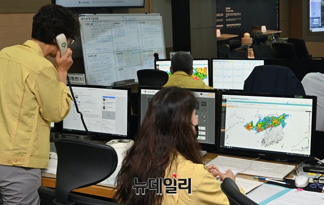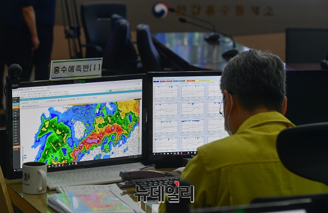 서울 서초구 한강홍수통제소 직원들이 3일 오후 상황실에서 강수 상황을 지켜보고 있다. 기상청은 3일 중부지방을 중심으로 돌풍과 천둥·번개를 동반한 시간당 50~80㎜의 강한 비가 내릴 것으로 예보했다.