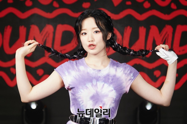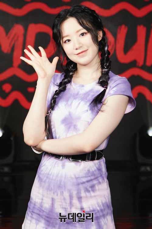 걸그룹 (여자)아이들 멤버 슈화가 3일 오후 온라인으로 진행된 첫 번째 싱글 '덤디덤디 (DUMDi DUMDi)'쇼케이스에서 포토타임을 갖고 있다.