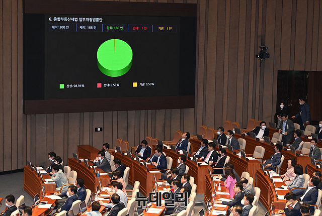 '부동산 3법(소득세·법인세·종부세법 개정안)'이 4일 오후 국회 본회의장에서 열린 제380회 국회(임시회) 제8차 본회의에서 통과되고 있다.