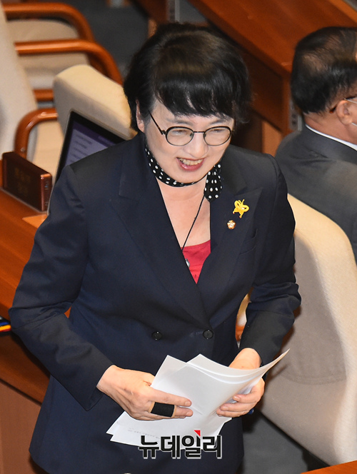 김진애 열린민주당 의원이 4일 오후 국회에서 열린 본회의에서 종합부동산세법 일부개정법률안에 대한 찬성 토론을 마치고 자리로 향하고 있다.