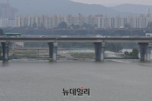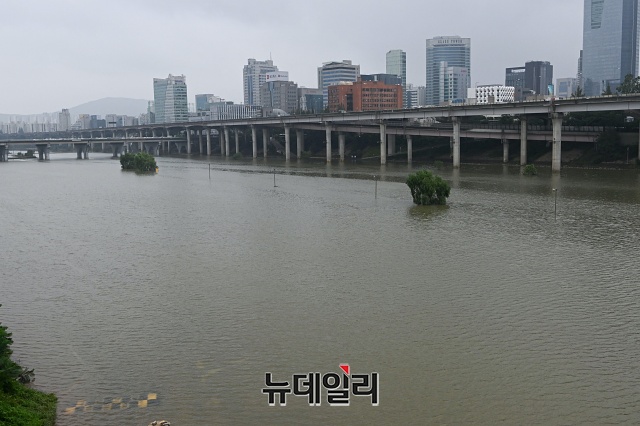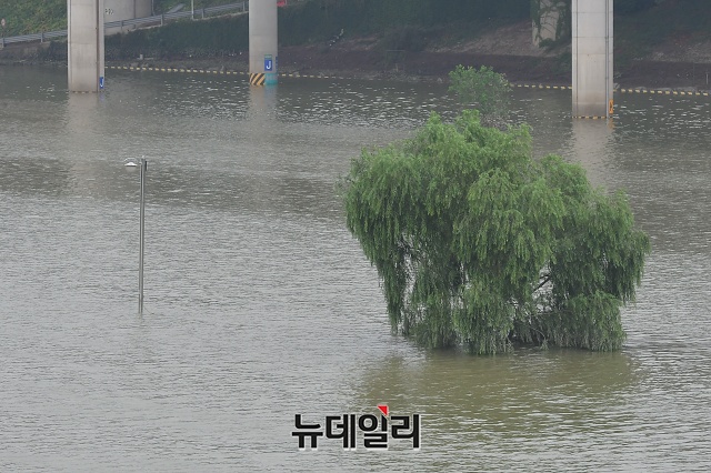 서울과 경기 등 중부지역에 집중호우가 지속되는 4일 오후 서울 송파구 탄천주차장 일대가 불어난 한강물에 잠겨 있다.