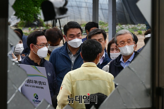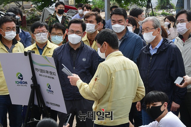 김종인 미래통합당 비상대책위원장, 주호영 원내대표가 5일 오전 경기 이천시 산양1리 마을회관 앞에서 수해 현황 브리핑을 듣고 있다.