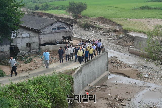 김종인 미래통합당 비상대책위원장, 주호영 원내대표가 5일 오전 경기 이천시 산양1리 수해현장을 살피고 있다.
