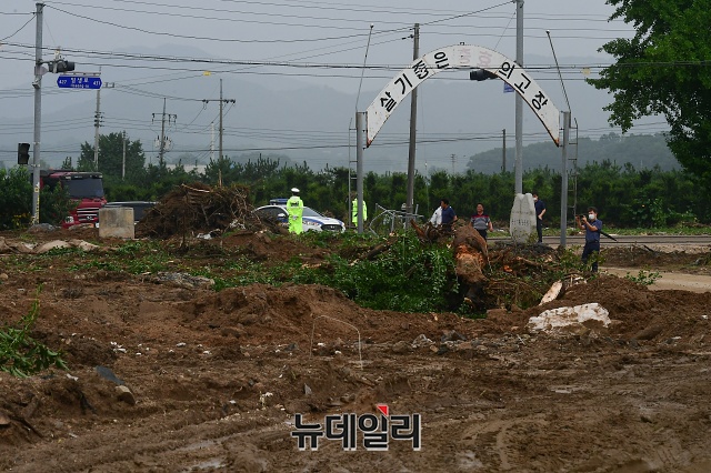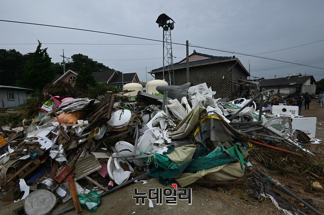 2일 경기권역에 집중호우가 내리면서 경기 이천 산양저수지 제방이 무너졌다. 담수량 6만 5,000여 톤의 물이 산양1리 마을을 덮쳐 침수피해를 입었다. 인명피해는 없었다. (경기 이천=권창회 기자)