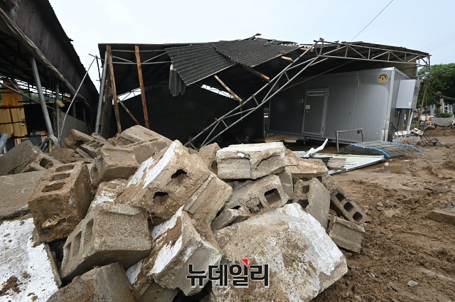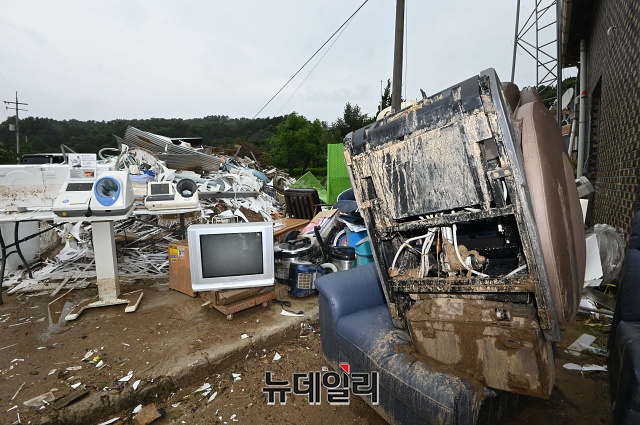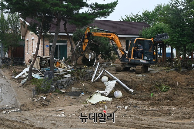 중부지역에 집중호우로 경기 안성, 이천 등 일부 지역이 침수피해를 입은 5일 오전 경기 이천시 산양1리 마을에서 수해복구 작업이 진행되고 있다.