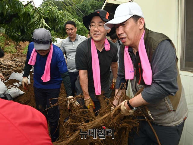 주호영 미래통합당 원내대표를 비롯한 의원들이 5일 오전 충북 충주 엄정면 비석마을 인근 수해현장을 찾아 피해 복구 작업을 하고 있다.