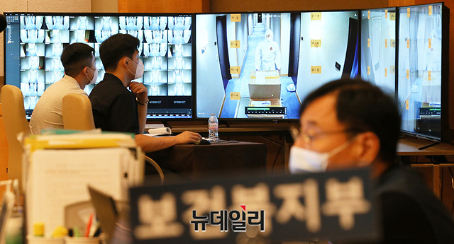보건복지부 중앙사고수습본부가 5일 오후 인천 영종도 소재의 임시생활시설에서 해외입국자 시설에 마련된 종합상황실에서 업무를 보고 있다. (사진=공동취재단)