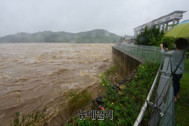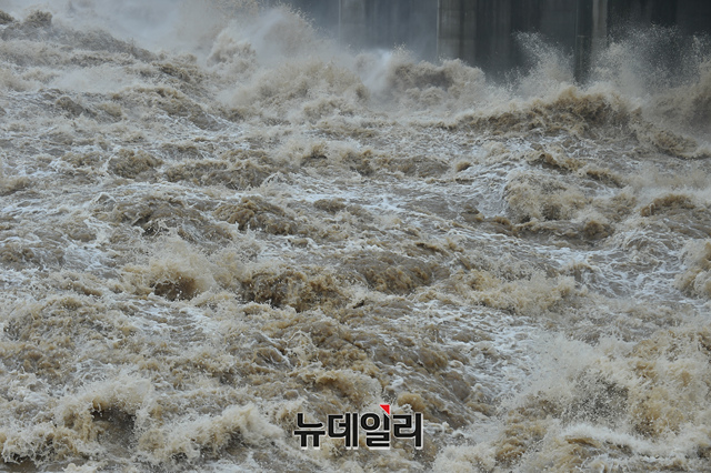 북한의 황강댐 무단방류와 집중호우로 6일 오전 경기 연천군 군남댐이 13개의 수문을 모두열고 초당 1만 1천 톤이 넘는 물을 방류하고 있다. 이 영향으로 연천과 파주 주민 수천여명이 긴급 대피했다. (경기 연천=이종현 기자)