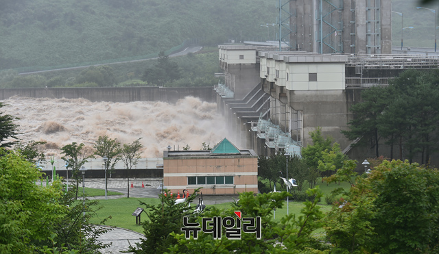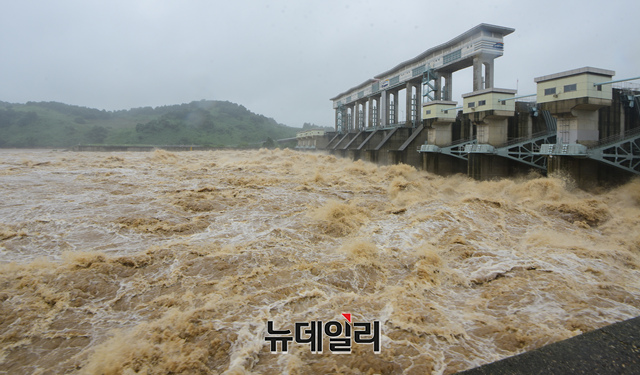 북한의 황강댐 무단방류와 집중호우로 6일 오전 경기 연천군 군남댐이 13개의 수문을 모두열고 초당 1만 1천 톤이 넘는 물을 방류하고 있다. 이 영향으로 연천과 파주 주민 수천여명이 긴급 대피했다. (경기 연천=이종현 기자)