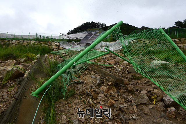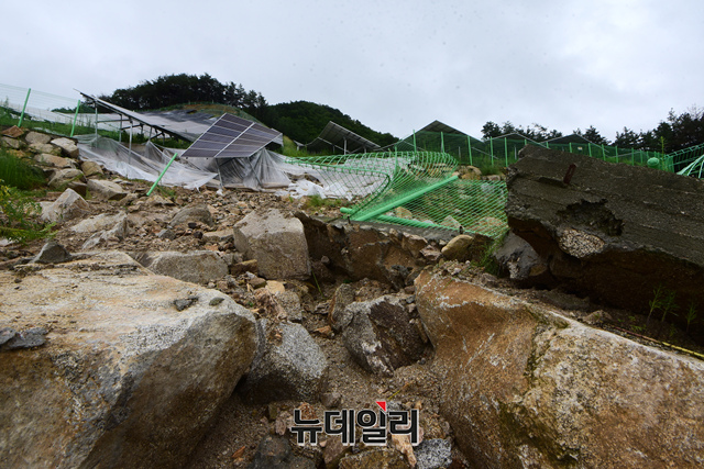 강원·중부지방에 호우특보가 발효된 6일 오후 강원 철원군 근남면 태양광 발전소가 비로 인한 산사태 피해로 무너져 있다.