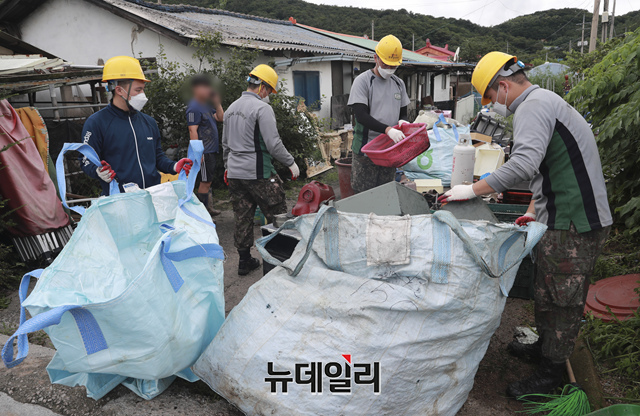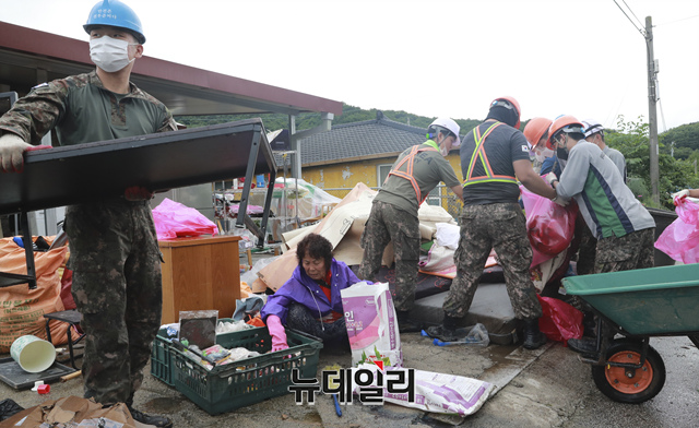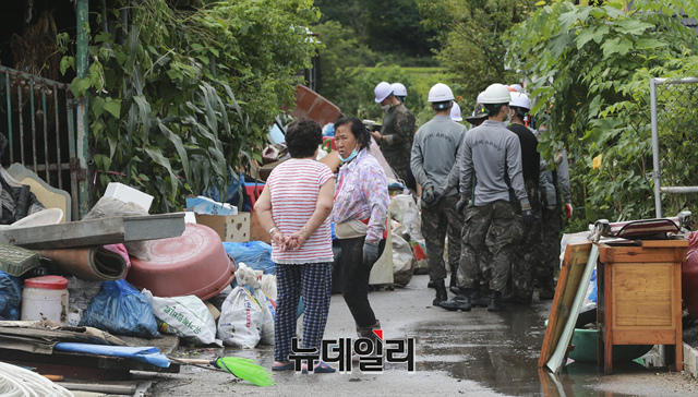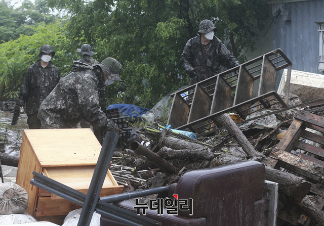 강원·중부지방에 호우특보가 발효된 6일 오후 수해가 발생한 강원 철원군 갈말읍 동막리 마을에서 국군 장병들이 복구 작업을 하고 있다. (강원 철원=이종현 기자)