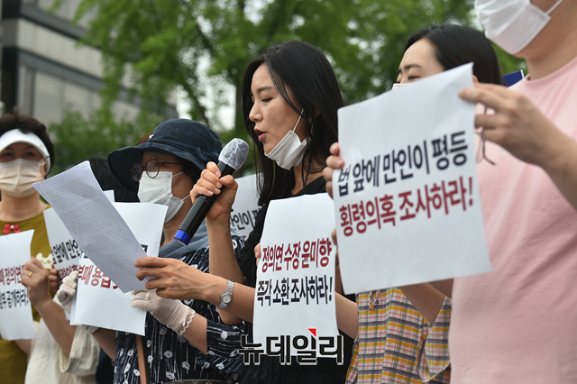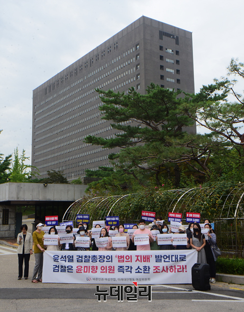 바른인권여성연합 회원들이 7일 서울 서초구 대검찰청 앞에서 기자회견을 갖고 정의연 회계 부정 의혹을 받고 있는 윤미향 더불어민주당 의원의 수사를 촉구하고 있다.