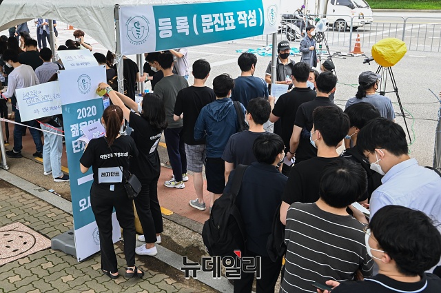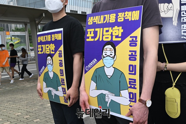 [포토] 집회 참석위해 피켓들고 줄 선 전공의들