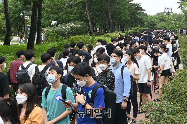 의과대학 정원 확대 방안에 반대해 집단휴진에 들어간 전공의들이 7일 오후 서울 영등포구 여의도공원 인근에서 열린 '젊은의사 단체행동' 집회에 참석하기 위해 줄을 서고 있다.