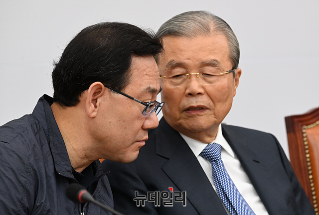 김종인 미래통합당 비상대책위원장과 주호영 원내대표가 10일 오전 국회에서 열린 비대위 회의에서 대화를 나누고 있다.