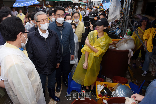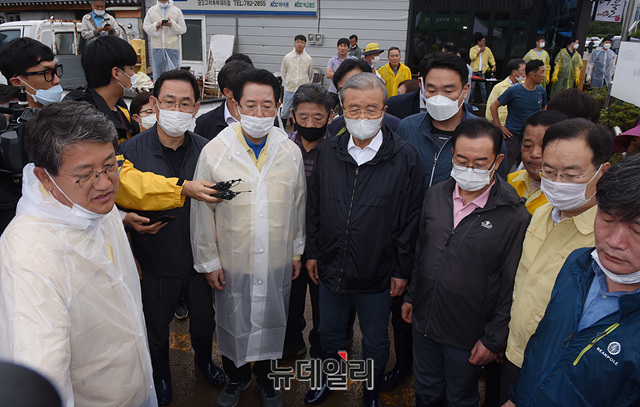 김종인 미래통합당 비상대책위원장, 주호영 원내대표, 이종배 정책위의장 등 지도부가 10일 오후 전남 구례군 구례5일장에서 침수피해를 입은 피해현장을 둘러보고 있다.