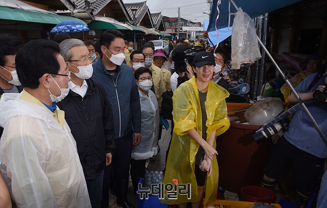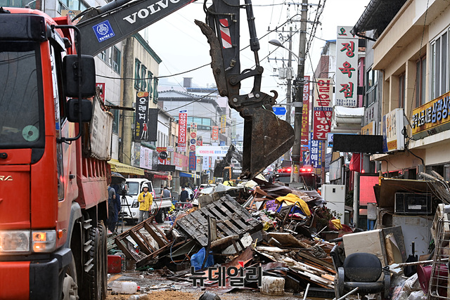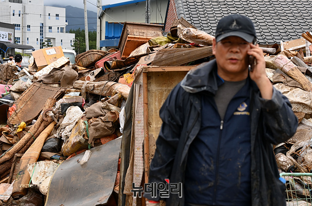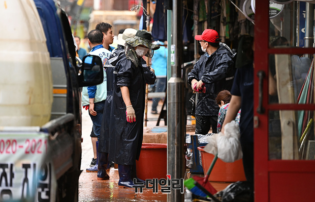 지난 7, 8일 양일간에 걸쳐 내린 400mm(평균)의 기록적인 폭우로 인해 피해를 입은 전남 구례군민들이 10일 오후 침수피해를 입은 시장을 재정비하고 있다.이날 김종인 미래통합당 비상대책위원장, 주호영 원내대표, 이종배 정책위의장 등 지도부가 구례5일시장을 찾아 피해자들을 위로했다.구례군은 섬진강과 지천인 서시천의 범람과 붕괴가 발생해 1,268억 원에 달하는 재산피해를 입었다.관계자에 따르면 이재민은 학교 등 공공시설 11개소에 분산 보호 조치 중이며 물이 빠진 9일 오전부터 복구 작업을 진행중이라 밝혔다. (전남 구례=박성원 기자)