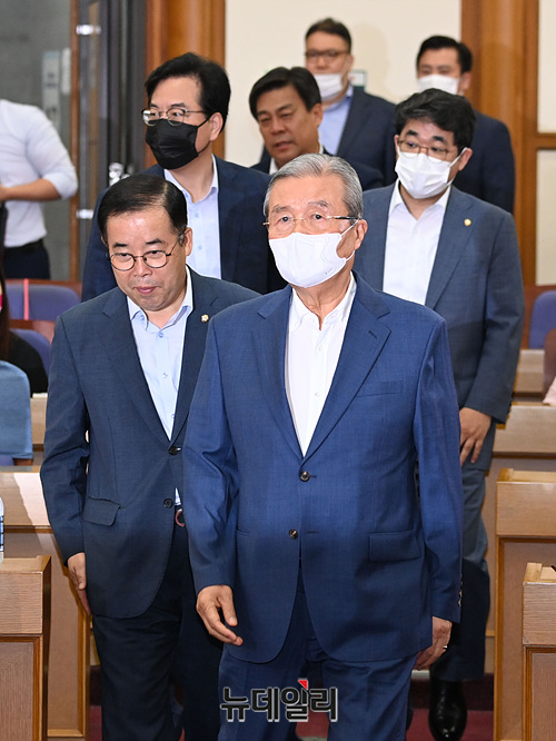 김종인 미래통합당 비상대책위원장, 과학기술정보방송통신위원회 간사인 박성중 의원 등 참석자들이 11일 오전 국회 의원회관에서 열린 '대한민국 미래를 위한 융합인재 육성 정책 토론회'에 입장하고 있다.