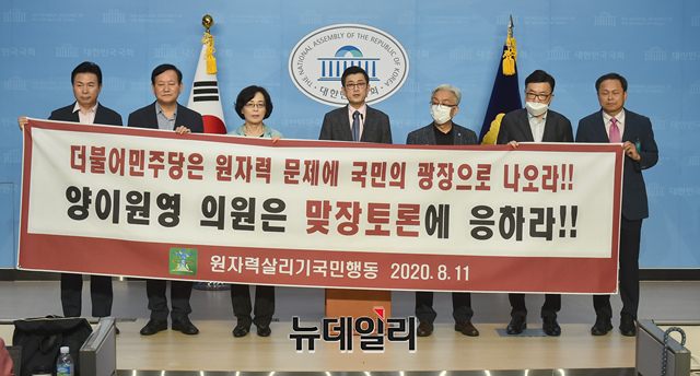 원자력살리기국민행동 상임공동대표들이 11일 오전 국회 소통관에서 탈원전을 주장하는 양이원영 더불어민주당 의원에게 원자력 관련 공개토론 제안 기자회견을 하고 있다.