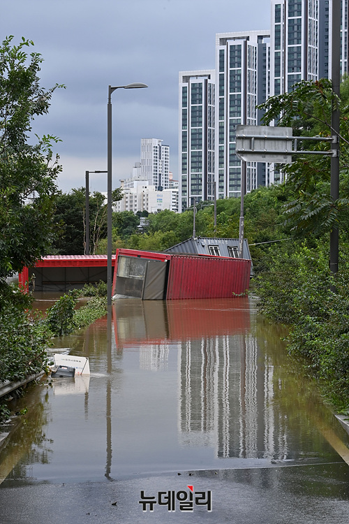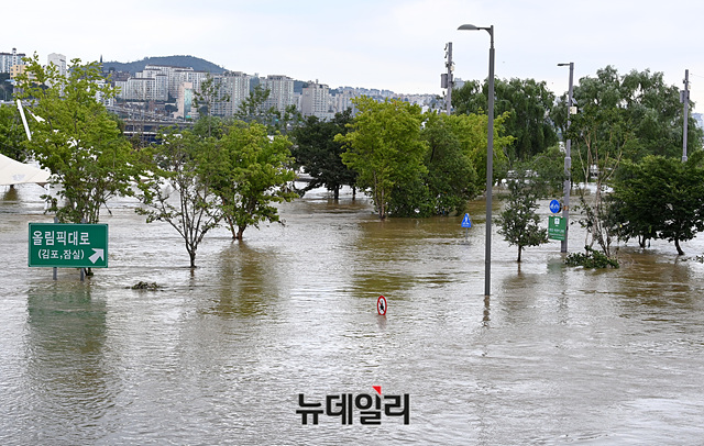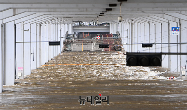 중부지역에 49일간 장마가 계속되며 역대 최장 장마로 기록된 11일 오후 서울 잠수교가 10일째 강물에 잠겨 통제되고 있다.