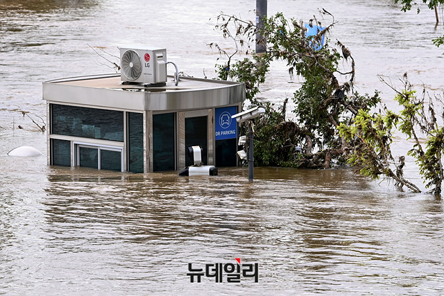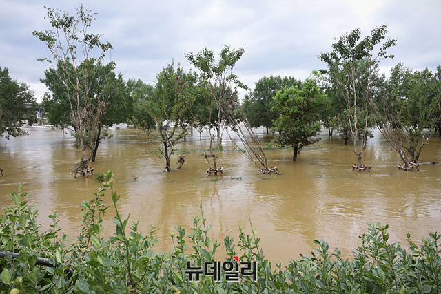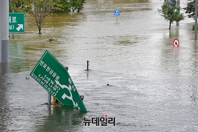 중부지역에 49일간 장마가 계속되며 역대 최장 장마로 기록된 11일 오후 서울 서초구 반포한강공원이 강물에 잠겨 통행이 통제됐다.