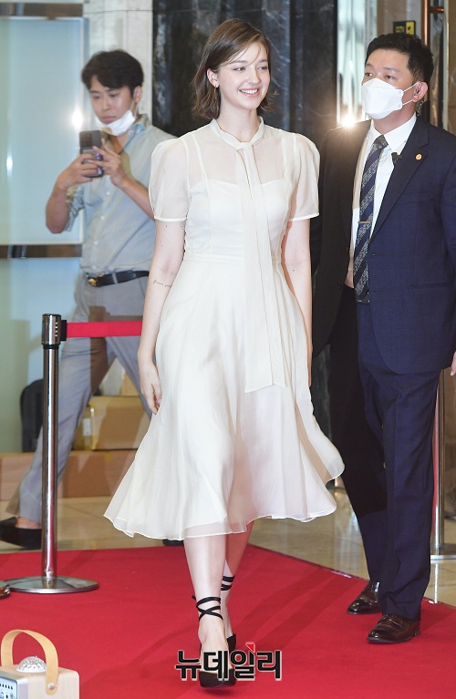 모델 안젤리나 다닐로바가 12일 오후 서울 강남구 라마다 호텔에서 열린 대한민국 예술문화인대상 시상식에서 포토타임을 갖고 있다.
