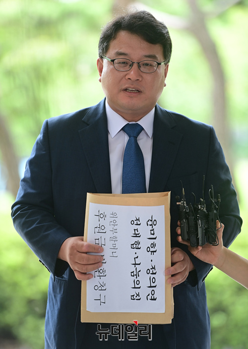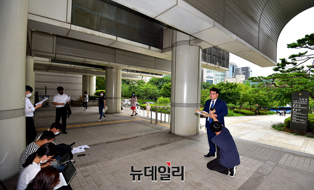 정대협, 정의연, 나눔의집을 상대로 후원금반환소송을 담당하고 있는 김기윤 변호사가 12일 오후 서울 서초구 서울지방법원으로 3번째 후원금반환소송을 접수하기 전 취재진의 질문에 답하고 있다.