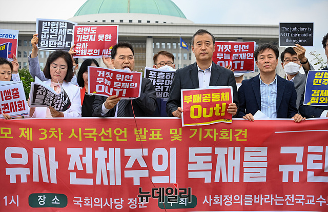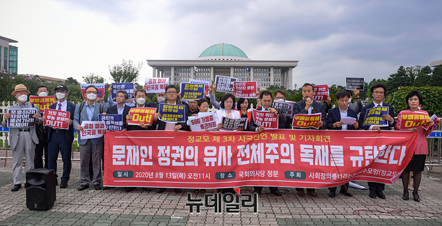이제 우리 정교모는 국가위기와 체제파괴의 암울한 상황에 처하여, 다시 문재인 정권이 행한 반(反)주권·반헌법·반문명의 폭정을 고발하는 한편, 대한민국 국민의 주권회복과 헌법수호·신문명 합류의 시대적 대의와 그에 대한 우리의 신성하고도 절실한 책무를 자각하여, 아래와 같이 국내외 모든 국민과 우방 앞에 선언한다.