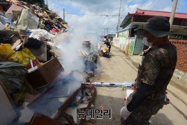 [포토] 수해입은 용전마을 방역 나선 국군장병들
