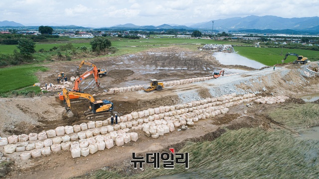 지속적인 장마로 전국에서 피해가 속출하고 있는 13일 오후 전북 남원시 금지면에서 공사인부들이 무너진 섬진강 둑을 응급복구하고 있다.