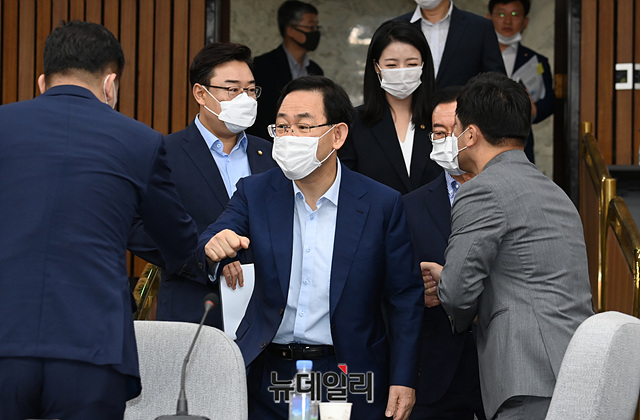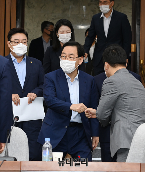 주호영 미래통합당 원내대표 등 지도부가 14일 오전 국회에서 열린 원내대책회의에 입장하고 있다.