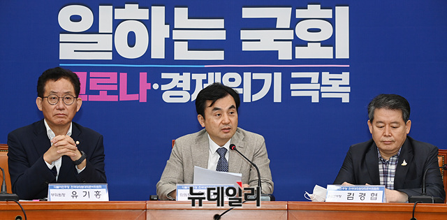 안규백 더불어민주당 전국대의원대회준비위원회 위원장이 14일 오전 국회에서 열린 '8.29 전국대의원대회준비위원회 기자간담회'에서 발언을 하고 있다.