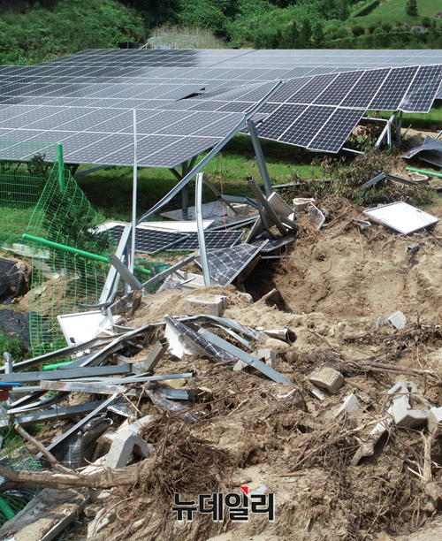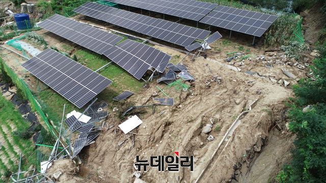 역대 최장 장마 기간을 기록한 14일 오후 충북 충주시 산청면 태양광 발전소가 비로 인한 산사태 피해로 무너져 있다.