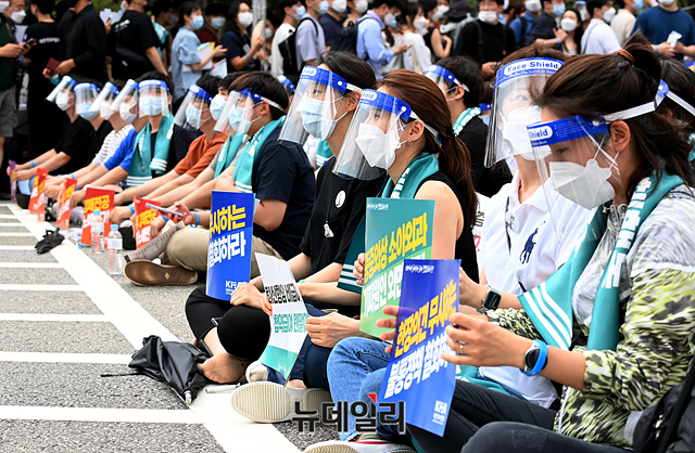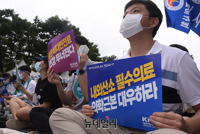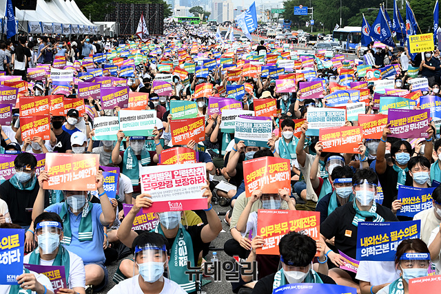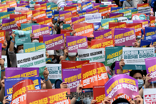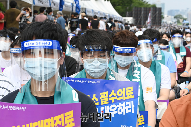 대한의사협회(의협), 대한전공의협의회(대전협) 등 참석자들이 14일 오후 서울 영등포구 여의도공원 인근에서 4대악 의료정책 저지를 위한 '전국 의사총파업 궐기대회'를 갖고 있다.이들은 △의과대학 정원 확대 △공공의대 설립 △첩약급여 시범사업 △비대면 진료 육성 등 4대 의료정책 중단을 요구하며 대회에 임했다.대회에 참석한 의사들은 "의사가 부족한 게 아니라 진료과와 지역에 따른 불균형한 인력 배치가 문제"라고 지적하고 있다.이날 동네의원 개원의와 대학병원과 같은 수련병원에서 근무하는 인턴과 레지던트 등 전공의가 대회에 참여했다. 환자의 생명과 직결되는 응급실, 중환자실, 투석실, 분만실 등의 업무를 담당하는 인력은 대회에 참석하지 않았다.