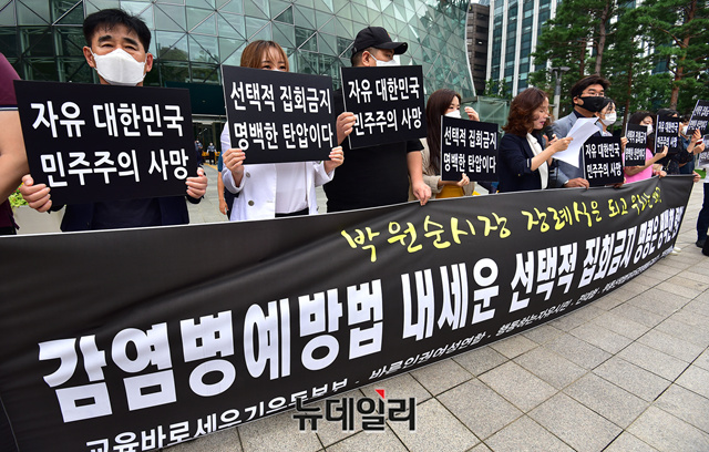 교육바로세우기운동본부와 전대협 등 6개 시민단체들은 기자회견에서 "서울시가 감염병예방법을 내세워 선택적 집회금지 명령을 내린 건 명백한 탄압"이라며 "새로운 방역수칙을 세워 국민들이 안전하게 집회·결사의 자유를 행사할 수 있도록 보장하라"고 했다.