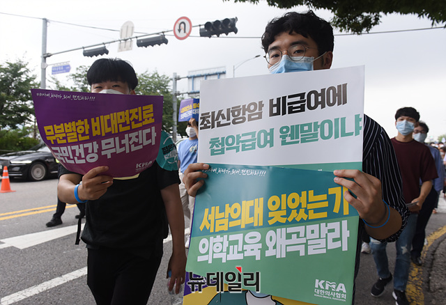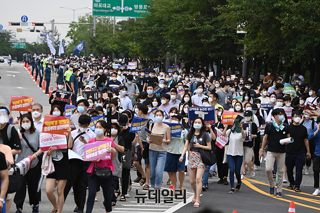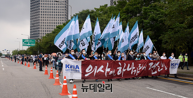 최대집 대한의사협회(의협) 회장 및 의협, 대한전공의협의회(대전협) 소속 의사들이 14일 오후 서울 영등포구 여의도공원 인근에서 4대악 의료정책 저지를 위한 '전국 의사총파업 궐기대회' 직후 국회대로를 행진하고 있다.이들은 △의과대학 정원 확대 △공공의대 설립 △첩약급여 시범사업 △비대면 진료 육성 등 4대 의료정책 중단을 요구하며 대회에 임했다.대회에 참석한 의사들은 "의사가 부족한 게 아니라 진료과와 지역에 따른 불균형한 인력 배치가 문제"라고 지적하고 있다.이날 동네의원 개원의와 대학병원과 같은 수련병원에서 근무하는 인턴과 레지던트 등 전공의가 대회에 참여했다. 환자의 생명과 직결되는 응급실, 중환자실, 투석실, 분만실 등의 업무를 담당하는 인력은 대회에 참석하지 않았다.의협 관계자에 따르면 이날 열린 '전국 의사총파업 궐기대회'에는 서울에서만 2만여 명의 의사들이 참석했다.