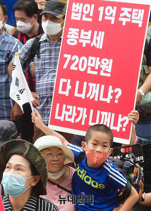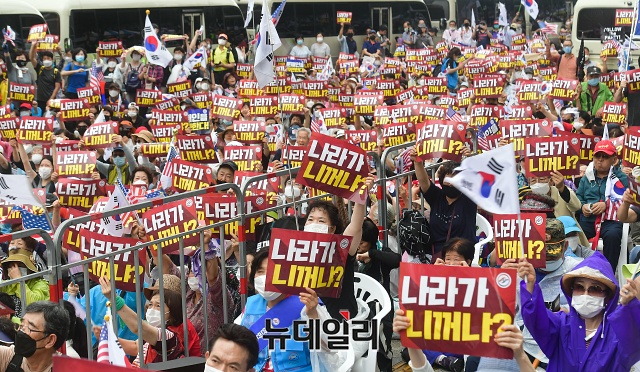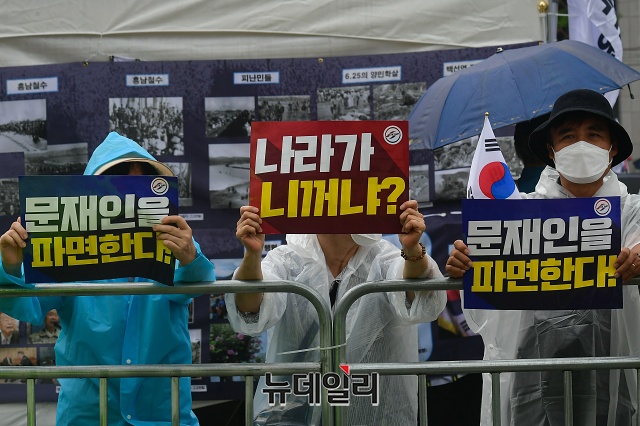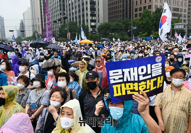 제75주년 광복절을 맞아 '문재인 퇴진 국민대회'에 참가한 시민들이 15일 오후 서울 종로구 광화문광장에서 피켓을 들고 구호를 외치고 있다. 이날 수도권 지역 호우주의보에도 불구하고, 오전부터 전국 각지에서 참가자들이 모여들었다.집회 참가자들은 '나라가 니꺼냐' '문재인을 파면한다' 등이 적힌 손피켓을 들었다. 집회에는 "나라의 주인은 국민이다" "대통령 퇴진" 등 구호를 외쳤다.이날 집회는 오후 4시 30분께 마무리됐다. 집회 이후 청와대 방향으로 가두행진을 진행했지만 경찰이 청와대 입구를 막아 곳곳에서 충돌이 발생했다.