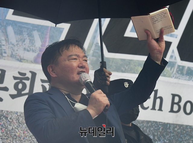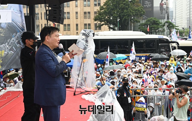 민경욱 4·15부정선거국민투쟁본부(국투본) 대표가 15일 오후 서울 종로구 동화면세점 앞에서 열린 '문재인 퇴진 국민대회'에서 발언을 하고 있다.집회 참가자들은 '나라가 니꺼냐' '문재인을 파면한다' 등이 적힌 손피켓을 들었다. 집회에는 "나라의 주인은 국민이다" "대통령 퇴진" 등 구호를 외쳤다.집회는 △부동산 경제파탄 △교과서 차별금지 △부정선거 개표조작 △시민단체의 시간 △한국교회의 시간 △본대회 개최 순으로 진행됐다.이날 집회는 오후 4시 30분께 마무리됐다. 집회 이후 청와대 방향으로 가두행진을 진행했지만 경찰이 청와대 입구를 막아 곳곳에서 충돌이 발생했다.
