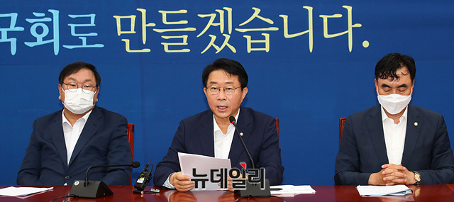 조정식 더불어민주당 정책위의장이 18일 오전 국회에서 열린 원내대책회의에서 모두발언을 하고 있다.