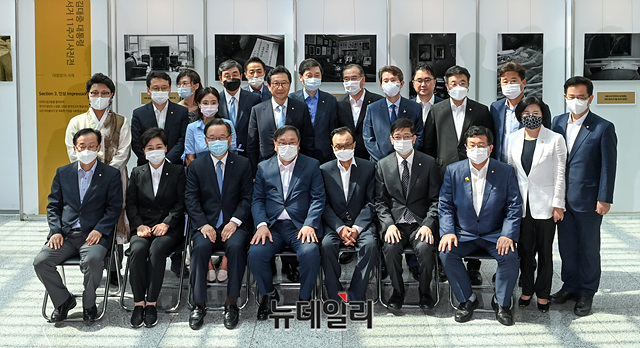 이해찬 더불어민주당 대표, 김태년 원내대표, 이인영 통일부 장관, 김부겸 전 장관 등 참석자들이 18일 오후 국회 의원회관에서 열린 '故 김대중 대통령 서거 11주기 사진전 개막식'에서 기념촬영을 갖고 있다.
