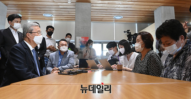 김종인 미래통합당 비상대책위원장이 19일 오후 광주 동구 옛 전남도청에서 오월어머니회 회원들, 옛 전남도청 복원지킴이 회원들과 대화를 나누고 있다. 김 위원장은 이날 오전 광주 5.18민주묘지를 찾아 오월 영령들에게 헌화하고 참배했다. (광주=박성원 기자)
